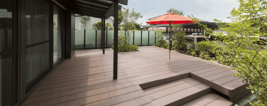 「エバーエコウッド」は、廃木材の木粉と再生プラスチックを主原料とした人工木デッキ材。木粉を50%以上含むため、天然木のようなやさしい質感と風合いを持ち、強度・耐久性・安全性にも優れています。夏場の表面温度上昇を従来比で約9℃抑え、裸足でも快適に過ごせます。折り返し構造の幕板で指詰めの心配も軽減され、見た目もすっきり。R幕板や多段幕板など、豊富なオプションでデザインの幅も広がります。お手入れも簡単で、頑固な汚れにも対応可能。カラーはナチュラル、ダークブラウン、ウォームグレー、ホワイトの4色展開。快適で安全、そして美しい屋外空間を実現するウッドデッキです。